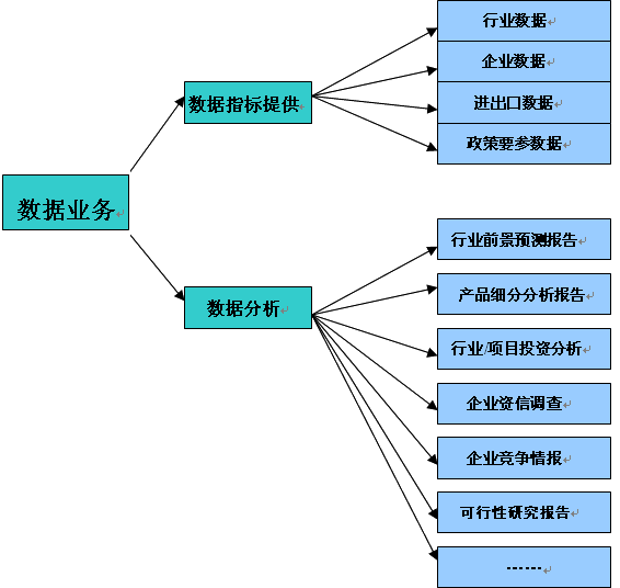国信中心数据业务主要分为两部分。第一是单纯的数据指标提供,第二是数据分析业务。其中数据分析业务可为行业分析报告、产品细分分析报告、行业/项目投资分析报告、企业资信调查报告、企业竞争情报分析报告、可行性研究报告等数据应用领域。